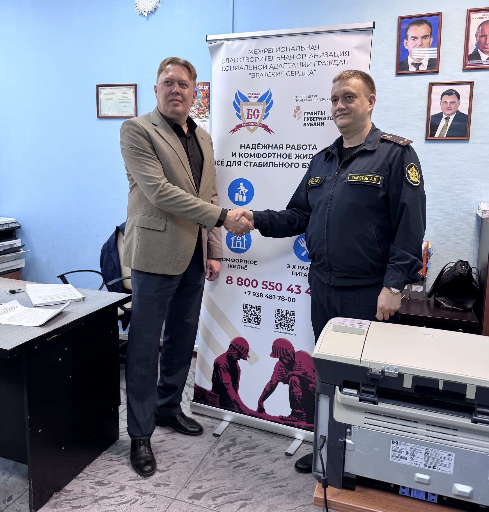 На днях «Братские сердца» заключили очередное соглашение о сотрудничестве с инспекцией исполнения наказаний по Прикубанскому округу города Краснодара в сфере пробации, социальной адаптации и возвращения человека к нормальной жизни.